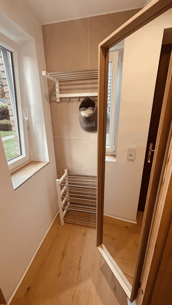 - Windfang mit Garderobe, körpergroßem Spiegel und Schlappen